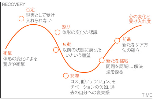 術後は、以前の身体のことがしのばれるかもしれません。 現在の状態を受け入れられるようになるまでに、いくつかの段階を経験します (下の図を参照)。 この悲嘆の段階はどの順序でも起こり、前進と後退を繰り返して、徐々に適応と受容に近づきます。 このような段階を知ることで、しばらくの間順調だった後で突然うまくいかなくなったときの感情を理解し、感情の波を認識できるようになります。